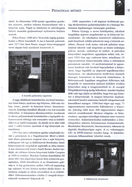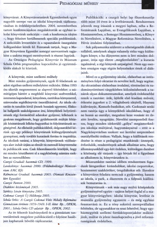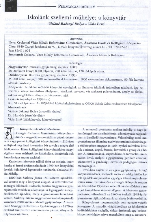 A csurgói Csokonai Vitéz Mihály Református Gimnázium könyvtárának rövid története, szolgáltatásai és kapcsolatai. A könyvtár, mint szellemi műhely.