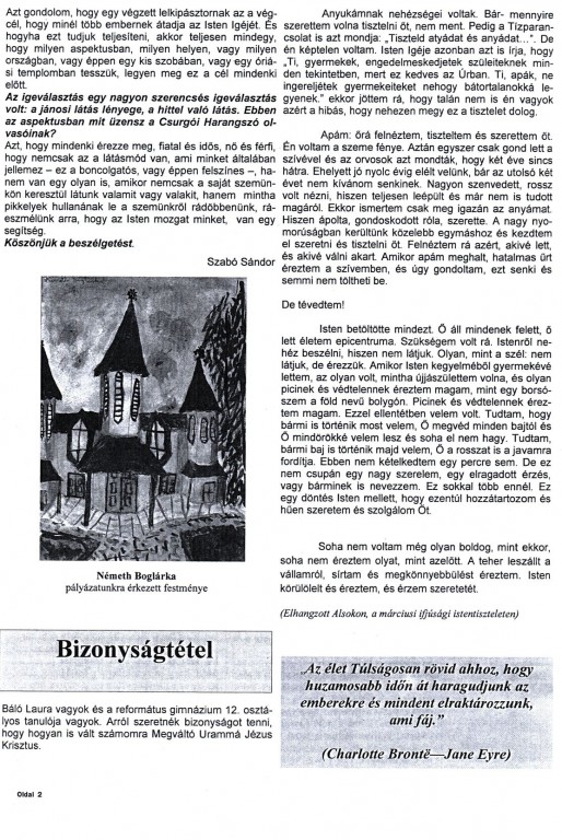 2010. márciusában Báló Laura (volt diákunk) teológus hallgató bizonyságtétele hangzott el. Forrás Csurgói Harangszó Megjelenés dátuma 2010. 04. 01. Rögzítés dátuma 2011. 01. 21.