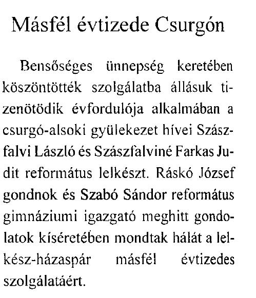 Szolgálatba állásuk tizenötödik évfordulója alkalmából köszöntötték a csurgó-alsoki gyülekezet hívei Szászfalvi László és Szászfalviné Farkas Judit református lelkészt.