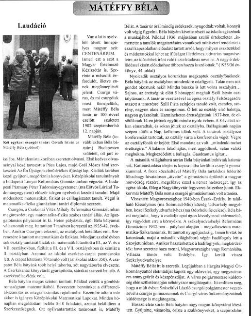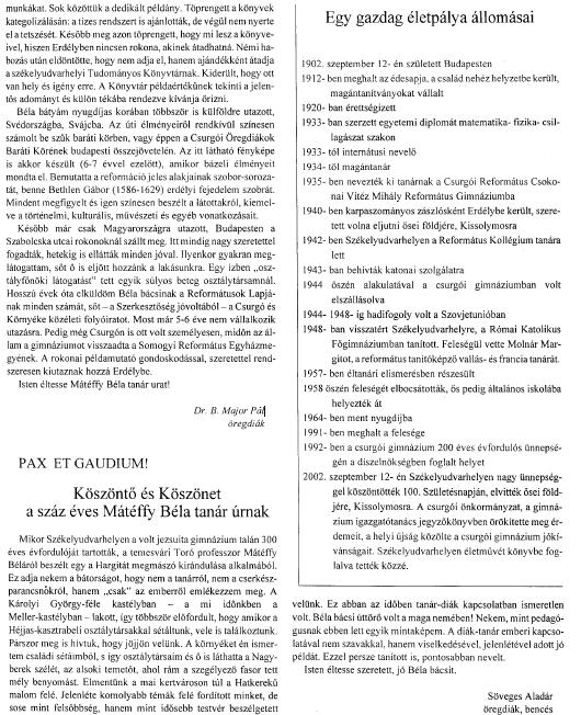 Dr. B. Major Pál és Söveges Aladár öregdiákok írásai a 100 évvel ezelőtt született (1902. szeptember 12.) egykori tanárukról, Mátéffy Béláról. A születésnapi köszöntés mellett a tanár úr életpályájának fontosabb állomásairól is olvashatunk.