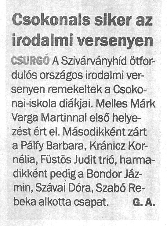 Szivárványhíd irodalmi versenyen remekeltek a Csokonais diákok Forrás Somogyi Hírlap Szerző Gamos Adrien Megjelenés dátuma 2018. 06. 04. Rögzítés dátuma 2018. 06. 11.
