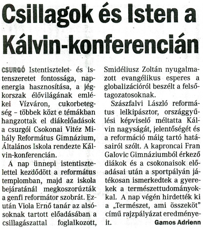 Gazdag program színesítette a csurgói Kálvin-konferenciát 2019. őszén. Forrás Somogyi Hírlap Szerző Gamos Adrienn Megjelenés dátuma 2018. 10. 22. Rögzítés dátuma 2018. 10. 26.