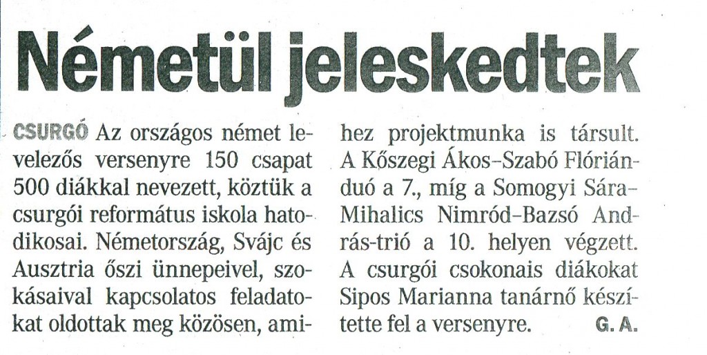 Az országos német nyelvű levelezős versenyen jól szerepeltek a csurgói diákok. Forrás Somogyi Hírlap Szerző Gamos Adrienn Megjelenés dátuma 2019. 01. 25. Rögzítés dátuma 2019. 02. 13.