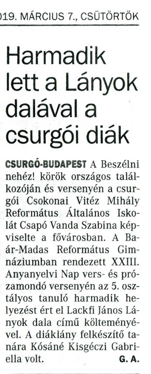 Csapó Vanda Szabina a Beszélni nehéz országos versenyen harmadik helyezést ért el. Felkészítő tanára Kósáné Kisgéczi Gabriella volt.