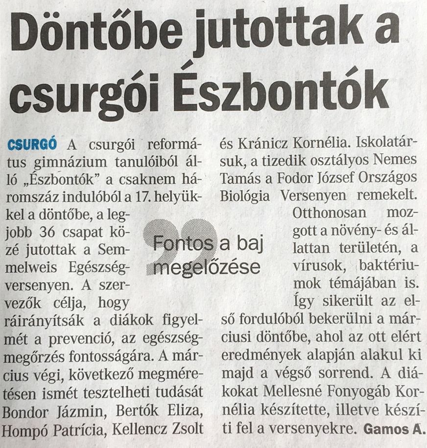 Szép eredményt ért el a gimnázium Észbontó csapata a Semmelweis Egészségversenyen, ezért bejutottak a döntőbe teljesítményükkel.