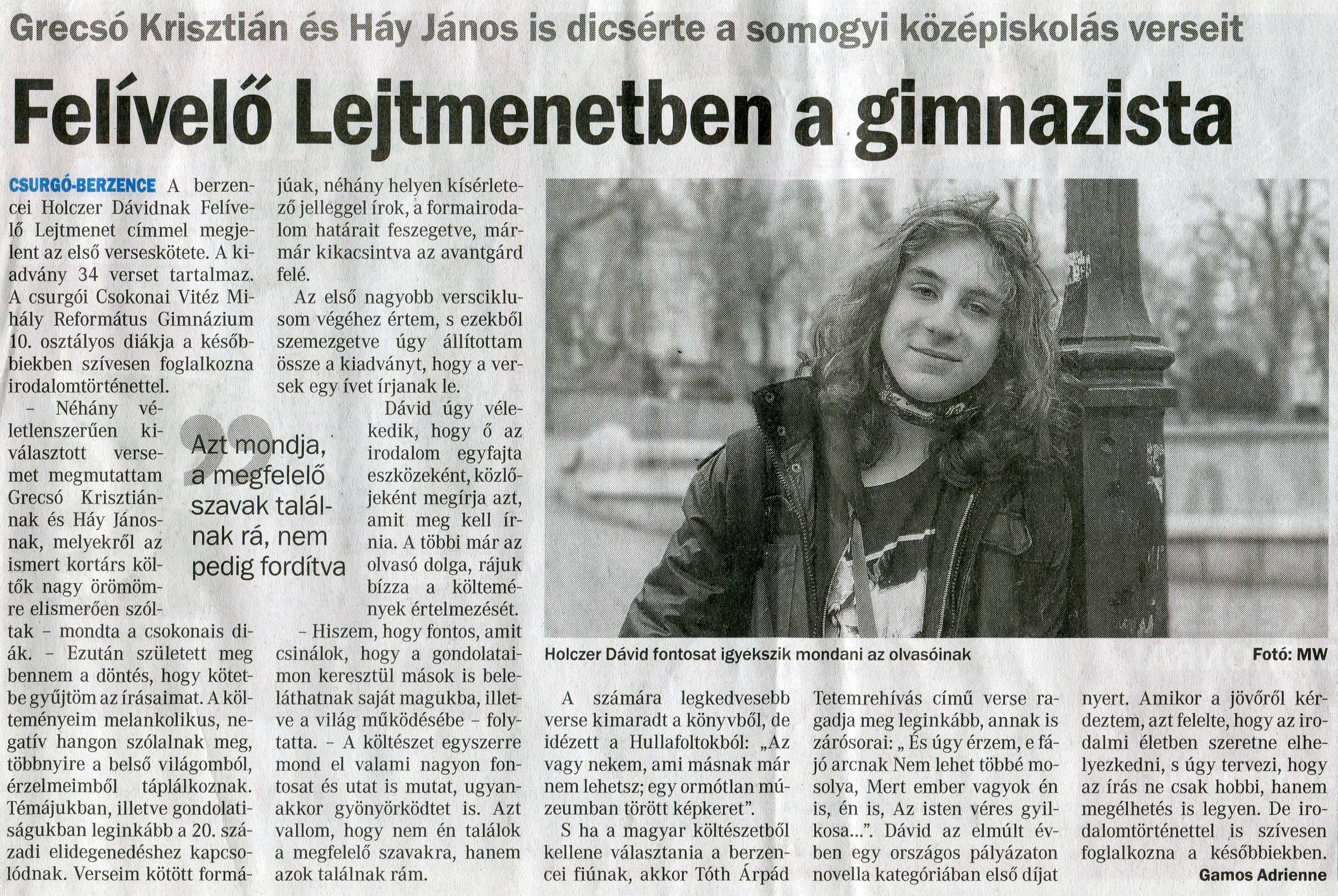 Holczer Dávidnak, a Csokonai gimnázium tanulójának Felívelő lejtmenet címmel megjelent az első verseskötete