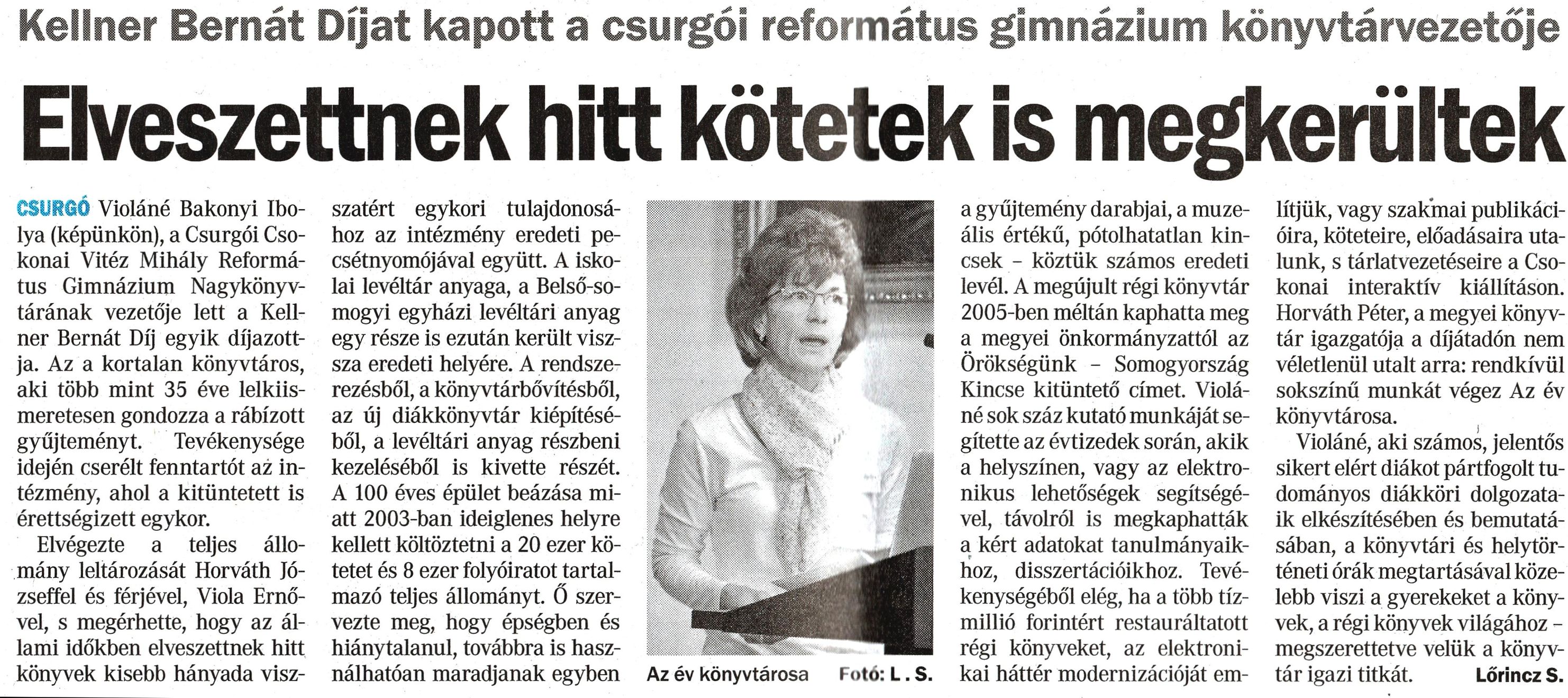 Violáné Bakonyi Ibolya már 35 esztendeje gondozza a gimnázium Nagykönyvtárát. Ezúttal a legjobb somogyi könyvtáros díját ítélték neki.
