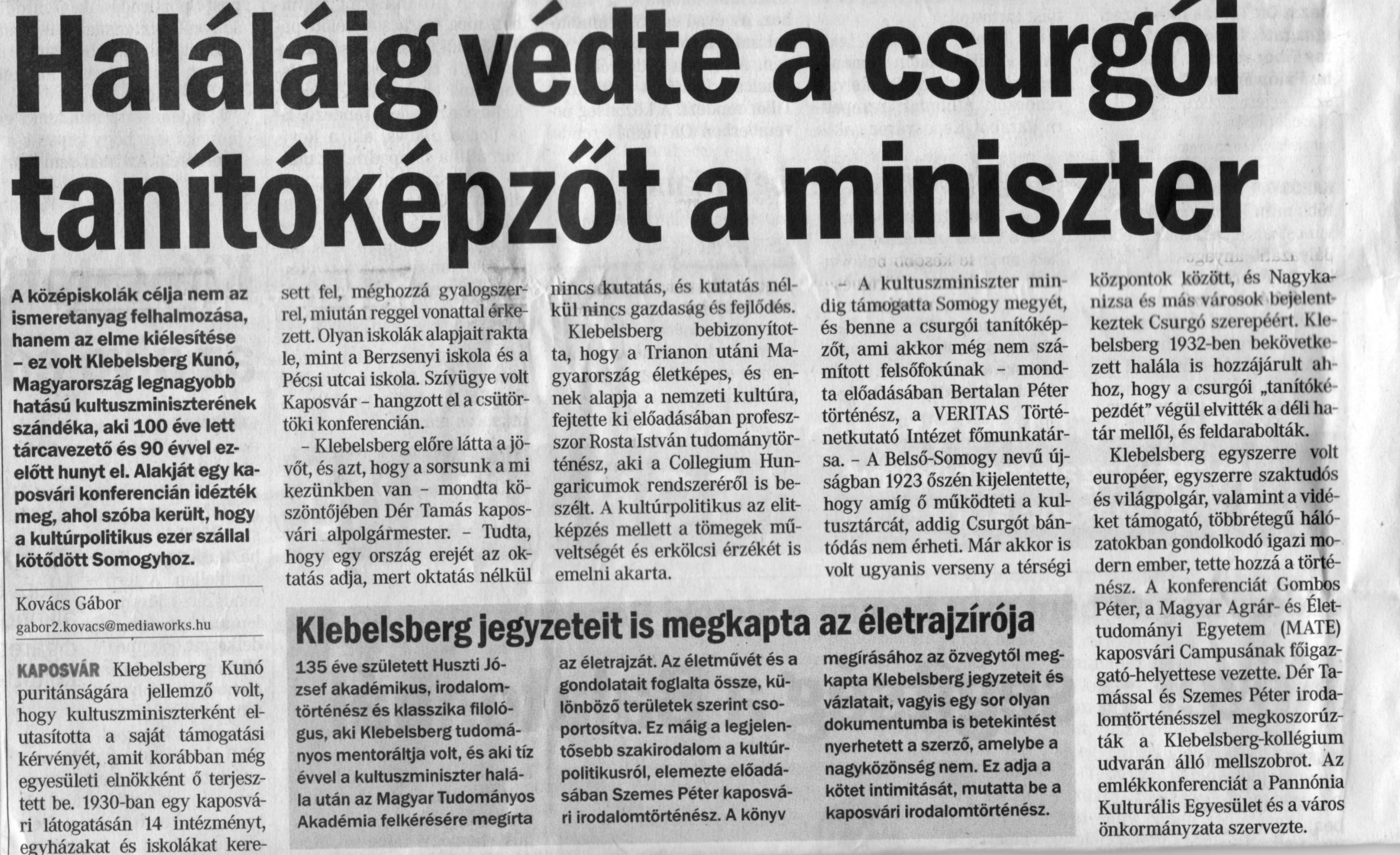 Haláláig védte a csurgói tanítóképzőt a miniszter