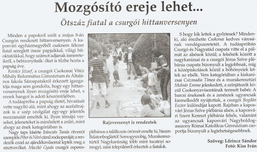 A papság évében rendezett megyei katolikus hittanversenyen ötszáz fiatal képviselte a saját egyházközségét. A verseny után a résztvevők megtekinthették Iváncsits Tamás Péter és Néró című rockoperáját.