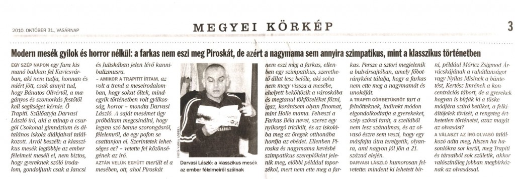 Darvasi László adott elő részleteket a Trapiti című könyvéből. Forrás Vasárnapi Somogyi Hírlap Szerző Varga Andrea Megjelenés dátuma 2010. 10. 31. Rögzítés dátuma 2010. 11. 08.