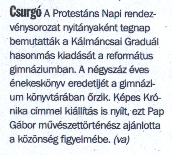 A Protestáns Napi rendezvénysorozat nyitányaként tegnap bemutatták a Kálmáncsai Graduál hasonmás kiadását a református gimnáziumban.