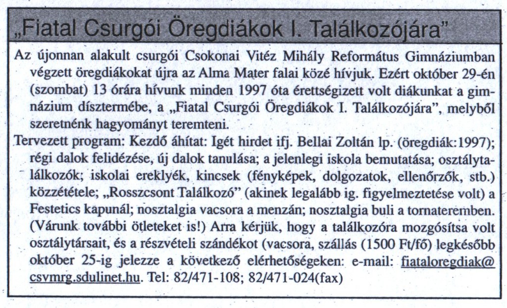 1997 óta érettségizett volt diákok első találkozója a református gimnázium dísztermében. Forrás Reformátusok Lapja Megjelenés dátuma 2005. 09. 18. Rögzítés dátuma 2010. 12. 14.