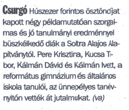 Négy tanuló (Pere Krisztina, Kucsa Tibor, Kálmán Dávid és Kálmán Ivett) kapott 20 ezer forintos ösztöndíjat a Soltra Alajos Alapítványtól a tanévnyitón.