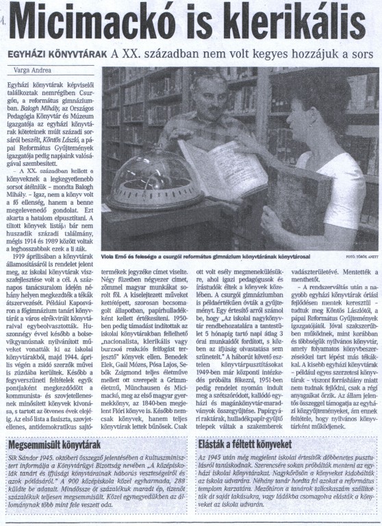 Egyházi könyvtárak képviselői találkoztak Csurgón a református gimnáziumban. A XX. században kellett a könyveknek a legkegyetlenebb sorsot átélniük - mondta Balogh Mihály, az Országos Pedagógia Könyvtár és Múzeum igazgatója. Az egyházi könyvtárak köteteinek XX. századi sorsáról volt szó.