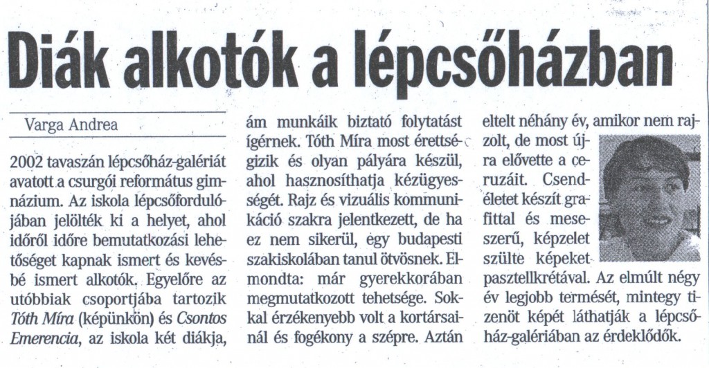 2002 tavaszán lépcsőház-galériát avatott a csurgói református gimnázium. Most Tóth Mira és Csontos Emerencia, az iskola két diákja kapott bemutatkozási lehetőséget.