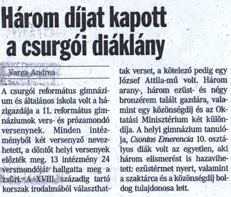 A csurgói református gimnáziumban rendezett 11. református gimnáziumok vers- és prózamondó versenyén Csontos Emerencia 10. osztályos diák volt az egyetlen, aki három elismerést is hazavihetett.