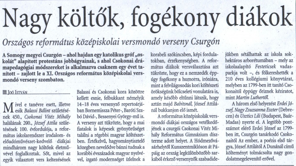 A XI. Országos református középiskolai versmondó verseny színhelye a csurgói református gimnázium díszterme volt.