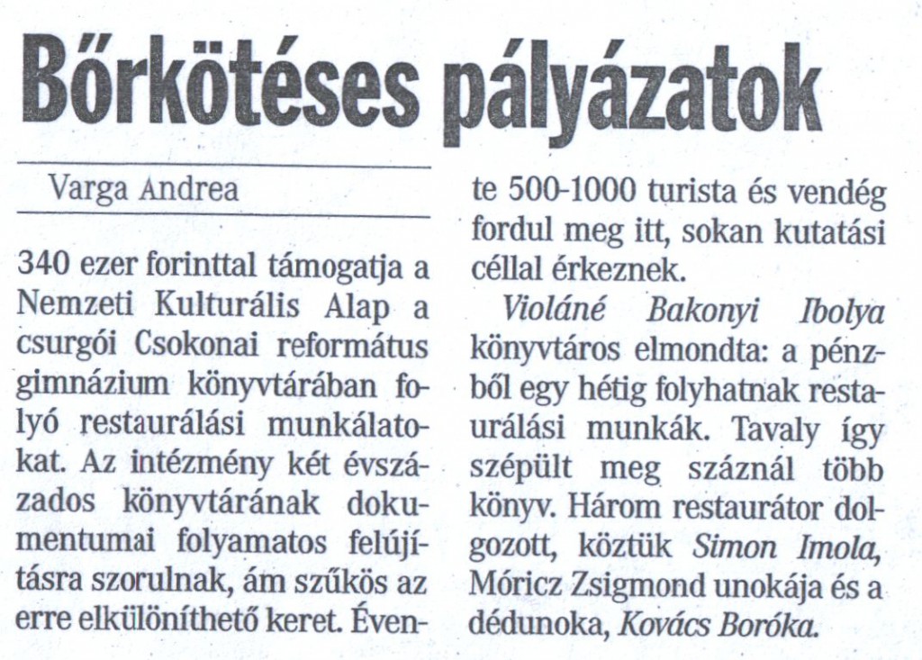 340 ezer forinttal támogatja a Nemzeti Kulturális Alap a csurgói Csokonai református gimnázium könyvtárában folyó restaurálási munkálatokat.