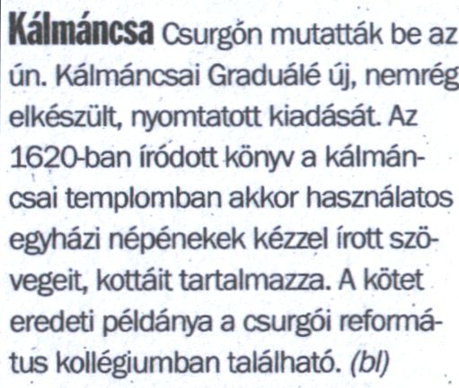 Csurgón bemutatták a Kálmácsai Graduálé új, nemrég elkészült, nyomtatott kiadását. Forrás Somogyi Hírlap Szerző bl Megjelenés dátuma 2005. 11. 05. Rögzítés dátuma 2010. 12. 28.
