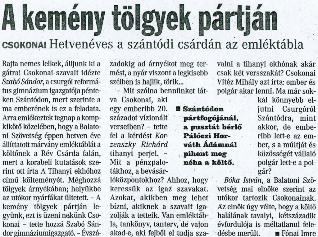 "Rajta nemes lelkek, álljunk ki a gátra" idézte Csokonai szavait Szabó Sándor a csurgói Református Gimnázium igazgatója Szántódon. A Balatoni Szövetség éppen hetven éve állíttatott emléktáblát a költőnek a Rév Csárda falán mert a kutatások szerint ott íródott Csokonai A Tihanyi ekhóhoz című költeménye.