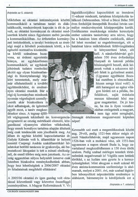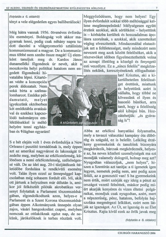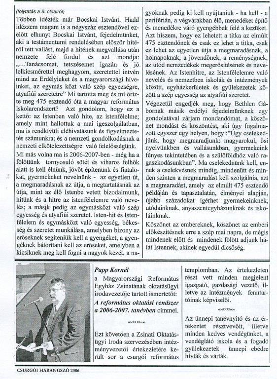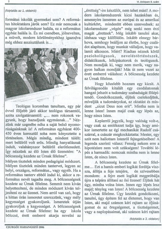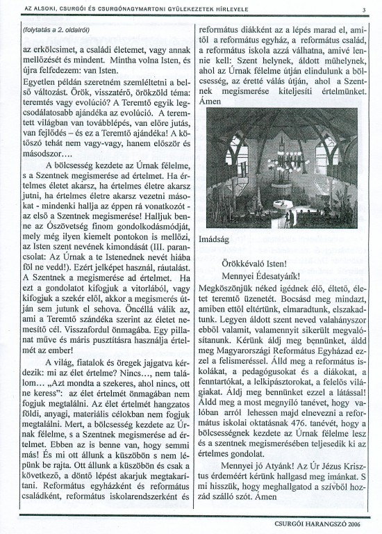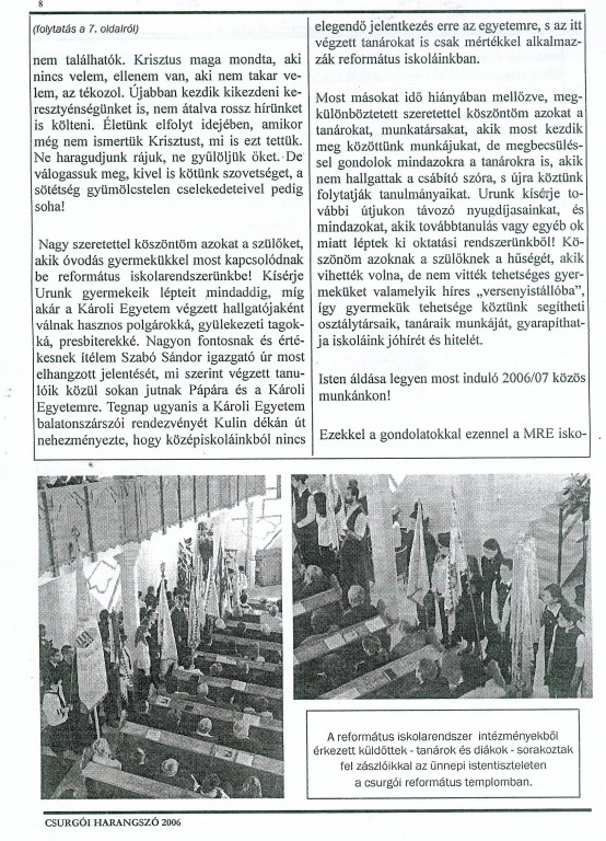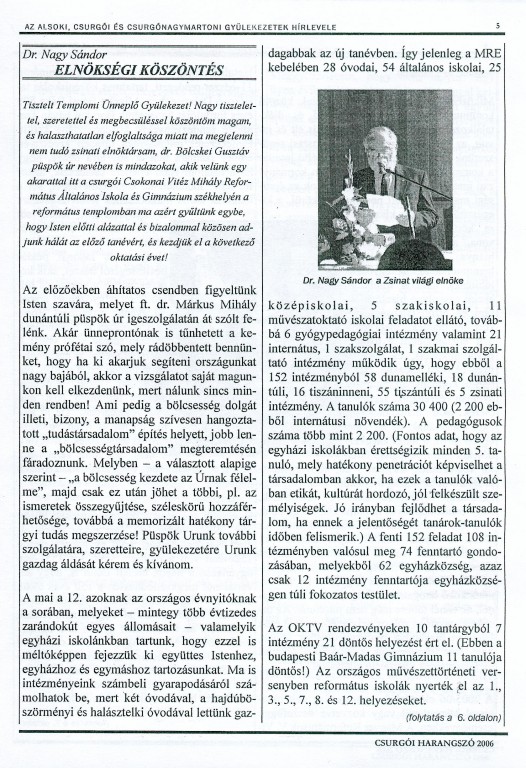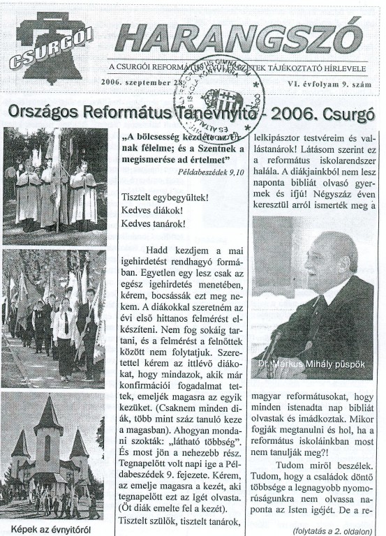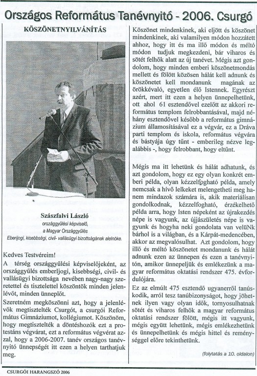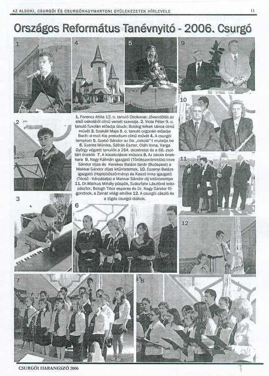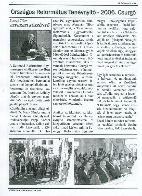 Dr. Márkus Mihály igehirdetése, Balogh Tibor esperesi köszöntője, Dr. Nagy Sándor elnökségi köszöntője, Szászfalvi László köszönetnyilvánítása és Papp Kornél ismertetője.