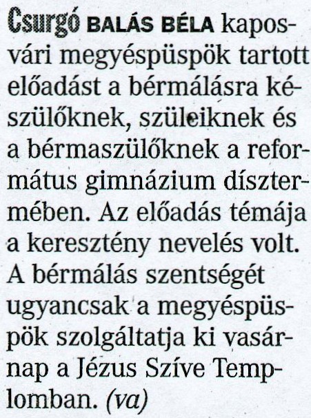 Balás Béla kaposvári megyéspüspök tartott előadást a bérmálásra készülőknek a református gimnázium dísztermében