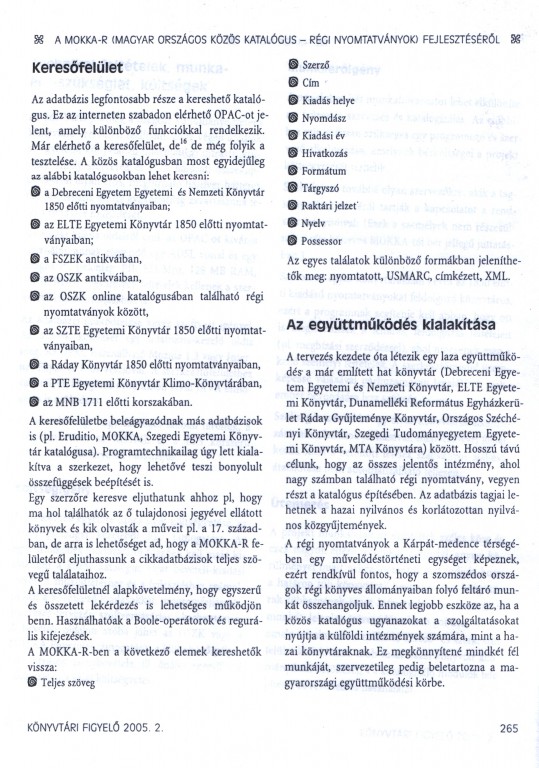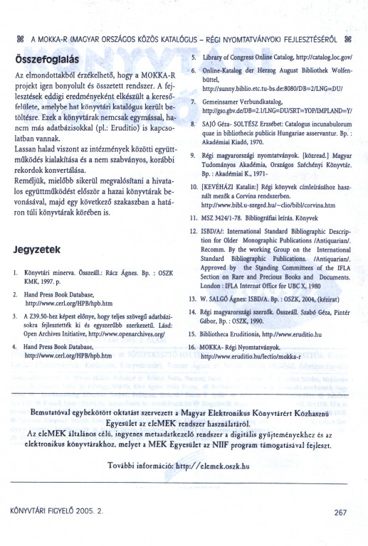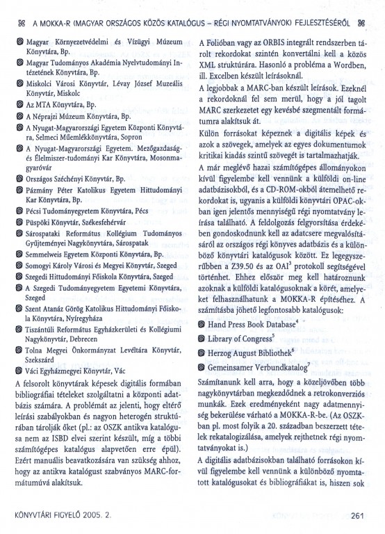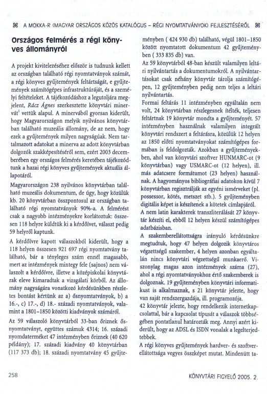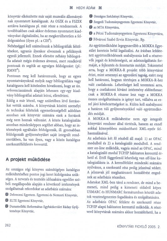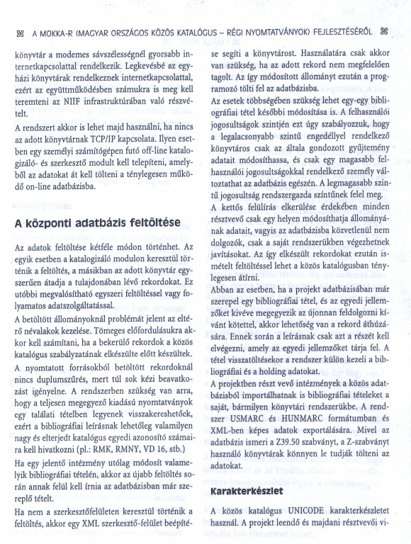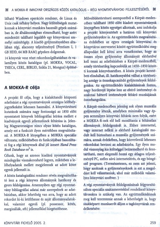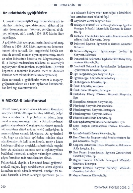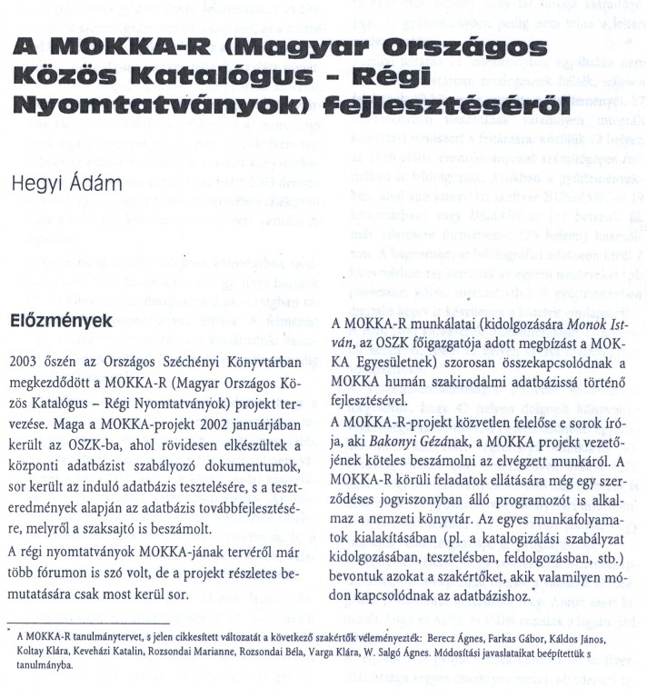 A MOKKA-R előzményei. Országos felmérés a régi könyves állományról. A MOKKA-R célja. Az adatbázis gyűjtőköre, a MOKKA-R adatforrásai, melyek között megtalálható a Csokonai Vitéz Mihály Református Gimnázium és Általános Iskola Könyvtára is. A projekt működése, a központi adatbázis feltöltése. A katalogizálás és a keresőfelület. Az együttműködés kialakítása. Technikai feltételek, munkaerő-szükséglet, költségek.