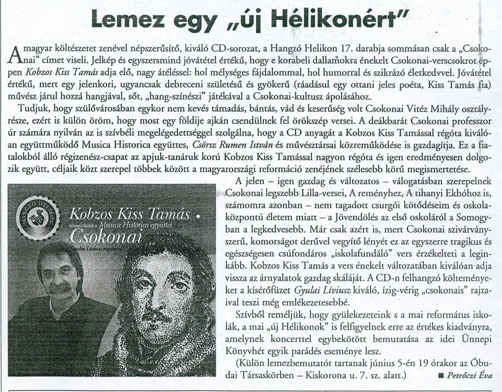 Megjelent a Hangzó Helikon 17. darabja. A magyar költészetet zenével népszerűsítő CD-sorozat új tagja a "Csokonai" címet viseli.