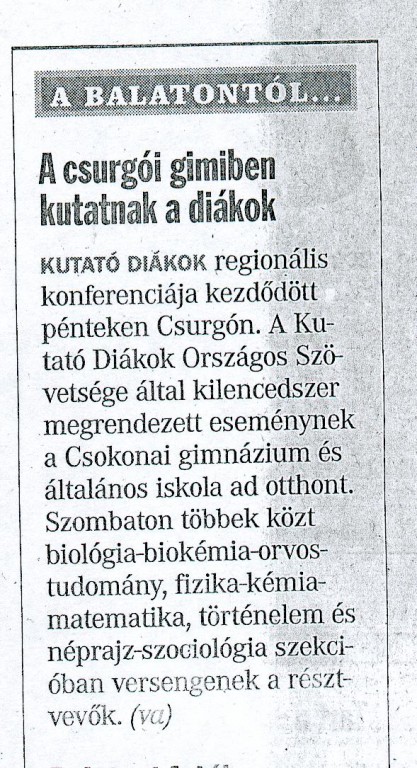 A Kutató Diákok Országos Szövetsége által kilencedszer megrendezett regionális konferencia pénteken kezdődött a csurgói Csokonai Vitéz Mihály Református Gimnázium és Általános Iskolában.