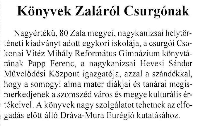 kiadványt adott egykori iskolája, a csurgói Csokonai