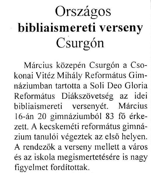 A Csokonai Vitéz Mihály Református Gimnáziumban tartotta a Soli Deo Glória Református Diákszövetség az idei bibliaismereti versenyét március 16-án, melyre 20 gimnáziumból 83-an érkeztek.