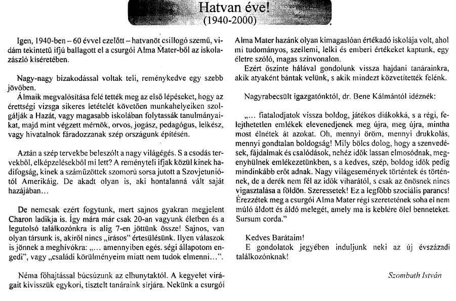1940-ben - 60 évvel ezelőtt - hatvanöt csillogó szemű, vidám tekintetű ifjú ballagott el a csurgói Alma Mater-ből az iskolazászló kíséretében.