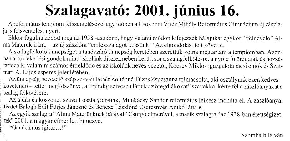 A református templom felszentelésével egy időben a Csokonai Vitéz Mihály Református Gimnázium új zászlaja is felszentelést nyert. Az 1938-asok is kifejezték hálájukat egykori Alma Materük iránt, az új zászlóra emlékszalagot kötöttek.