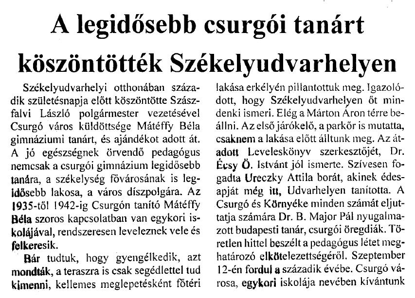 Székelyudvarhelyi otthonában 100. születésnapja előtt köszöntötte Szászfalvi László polgármester vezetésével Csurgó város küldöttsége Mátéffy Béla gimnáziumi tanárt, aki 1935-től 1942-ig volt tanár Csurgón a református gimnáziumban.