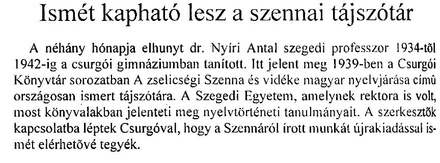A néhány hónapja elhunyt dr. Nyíri Antal szegedi professzor 1934-től 1942-ig a csurgói gimnáziumban tanított. Itt jelent meg 1939-ben a Csurgói Könyvtár sorozatban A zselicségi Szenna és vidéke magyar nyelvjárása című