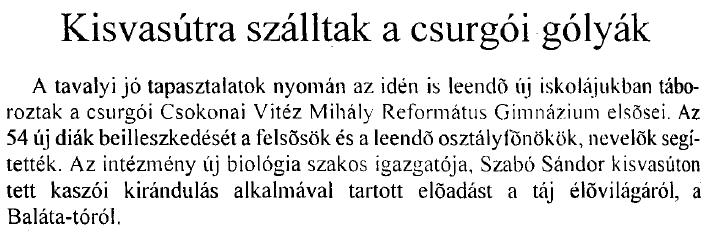 Az idén is leendő új iskolájukban táboroztak a csurgói Csokonai Vitéz Mihály Református Gimnázium elsősei. Az 54 új diák beilleszkedését a felsősök és a leendő osztályfőnökök, nevelők segítették. Az intézmény új biológia szakos igazgatója, Szabó Sándor kisvasúton tett kaszói kirándulás alkalmával tartott előadást a táj élővilágáról, a Baláta-tóról.