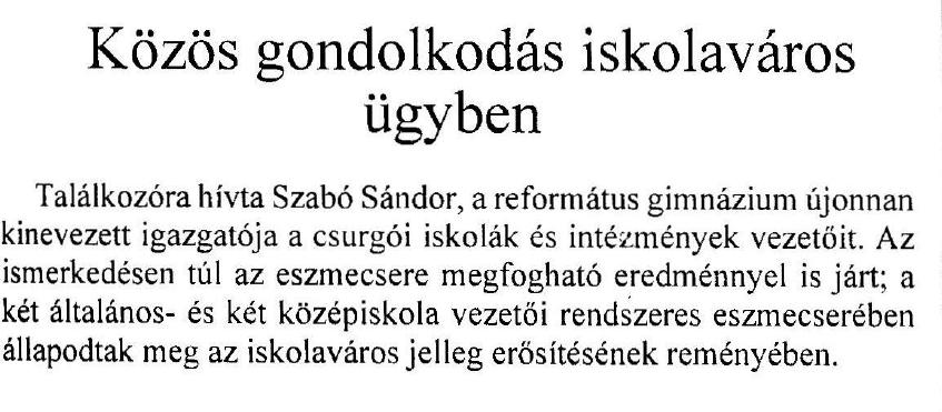 Találkozóra hívta Szabó Sándor, a református gimnázium újonnan kinevezett igazgatója a csurgói iskolák és intézmények vezetőit. Forrás Csurgó és környéke Megjelenés dátuma 2001. 11. 30. Rögzítés dátuma 2011. 01. 23.