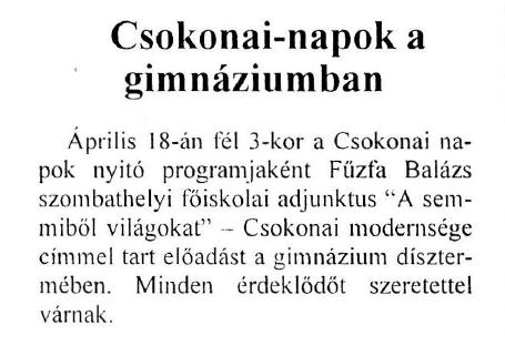 szombathelyi főiskolai adjunktus "A semmiből világokat" - Csokonai modernsége címmel tartott előadást a gimnázium dísztermében.