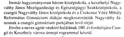 Nagyváthy János sírjának megkoszorúzása a gimnázium parkjában. Forrás Csurgó és környéke Megjelenés dátuma 1998. 02. 10. Rögzítés dátuma 2011. 01. 28.