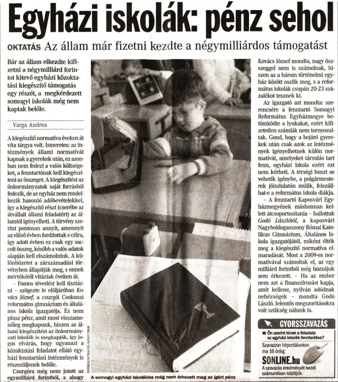 A megkérdezett somogyi iskolák még nem kaptak az állami kiegészítő normatívából, nyilatkozott a megyei lapnak Kovács József igazgató.