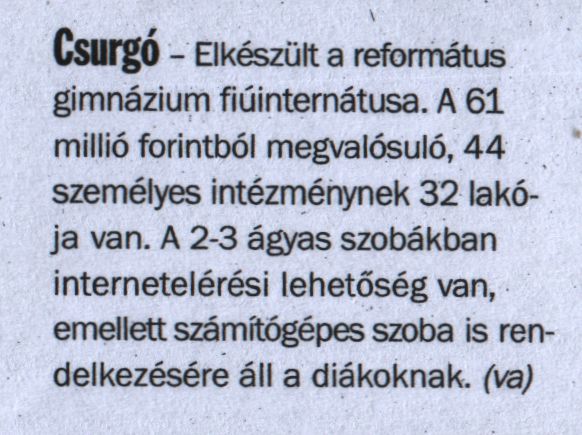 Elkészült a csurgói Református Gimnázium fiúinternátusa. Forrás Somogyi Hírlap Szerző Varga Andrea Megjelenés dátuma 2004. 09. 24. Rögzítés dátuma 2011. 03. 26.