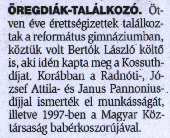 A csurgói Református Gimnázium öregdiákjai között van Bertók László költő is, aki az idén kapta meg a Kossuth díjat.