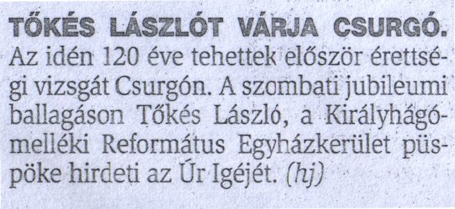 Tőkés László a hirdeti az Úr Igéjét a csurgói Református Gimnázium szombati jubileumi ballagásán. Forrás Somogyi Hírlap Megjelenés dátuma 2004. 05. 06. Rögzítés dátuma 2011. 03. 27.