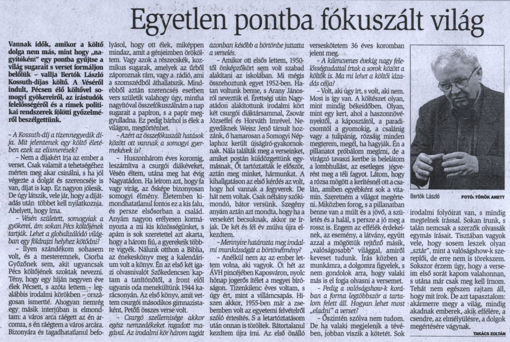 Bertók Lászlóval -volt csurgói diák, Kossuth-díjas költő- készített interjú. Forrás Somogyi Hírlap Szerző Takács Zoltán Megjelenés dátuma 2004. 04. 10. Rögzítés dátuma 2011. 03. 27.