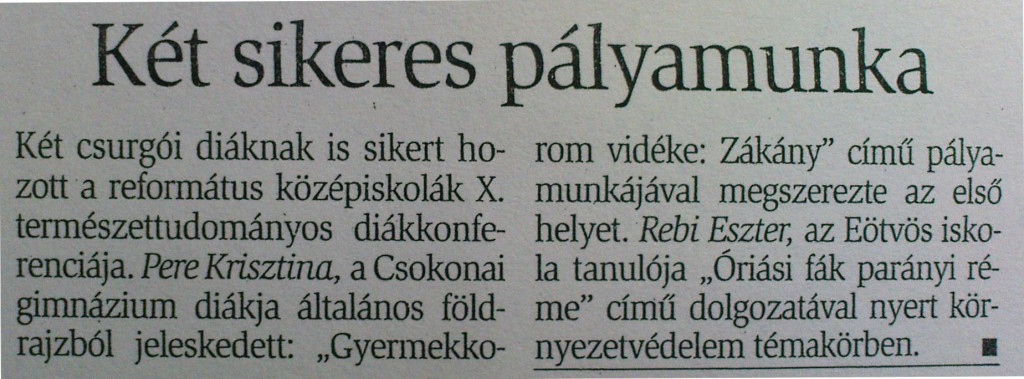 Két csurgói diáknak is sikert hozott az RKTDK X. diákkonferenciája. Pere Kriszina a Csokonai Gimnázium tanulója földrajzból és Rebi Eszter az Eötvös iskola tanulója környezetvédelemből szerezte meg az első helyet.