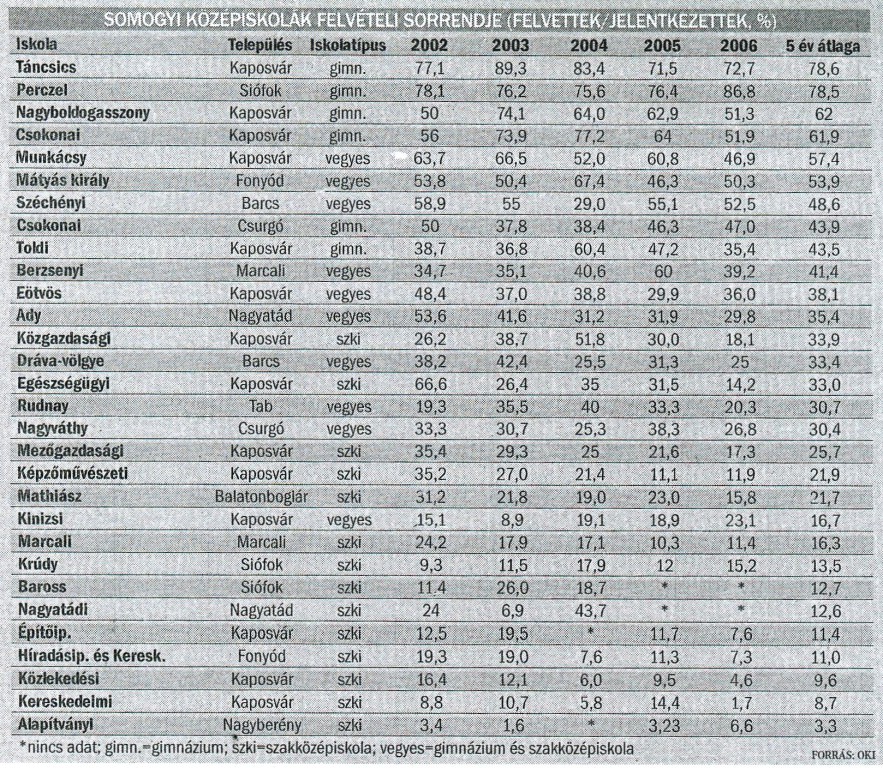 A középiskolák kistérségi felvételi rangsora után ezúttal egyes somogyi intézmények felvételi eredményeit vizsgáljuk.