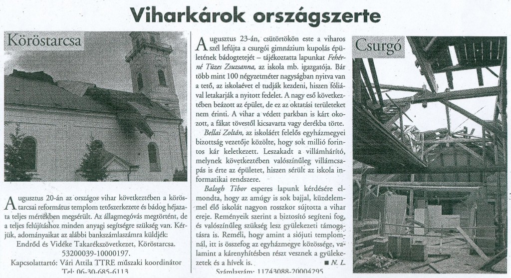 Augusztus 23-án este a viharos szél lefújta a csurgói gimnázium kupolás épületének bádogtetejét, és a védett parkban is nagy kárt okozott.