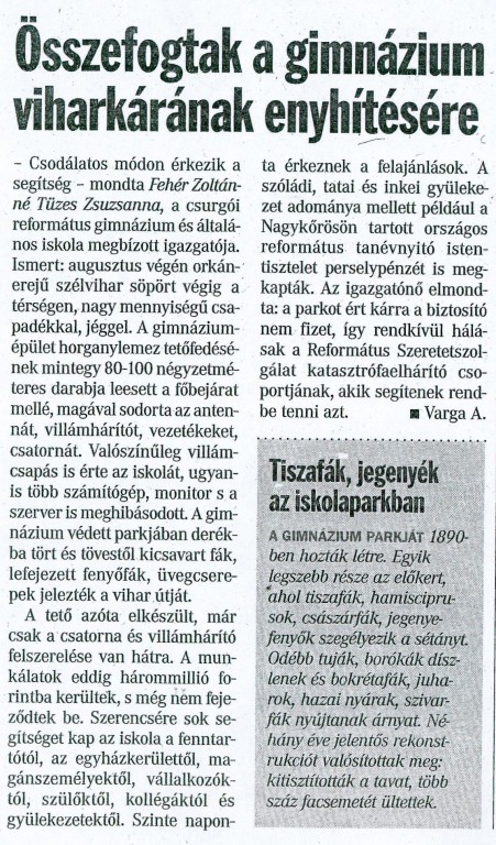 Az augusztusi viharkárok helyreállításához sok segítséget kap az iskola a fenntartótól, az egyházkerülettől,magánszemélyektől,vállalkozóktól, szülőktől, kollégáktól és gyülekezetektől.