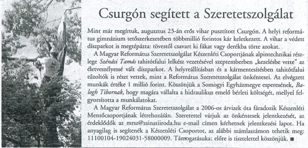 A Magyar Református Szeretetszolgálat Készenléti Csoportjának alpintechnikai részlege Szénási Tamás tahitótfalui lelkész vezetésével szeptemberben "kezelésbe vette" az életveszélyessé vélt díszparkot.
