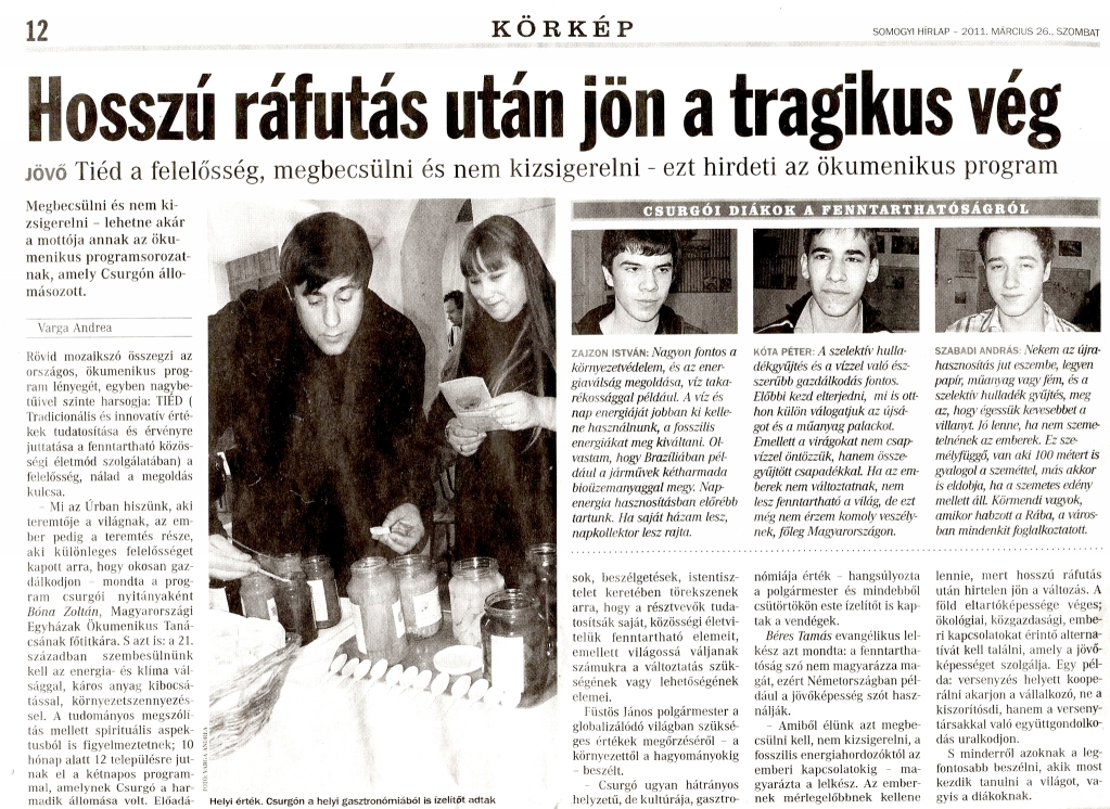 Tradicionális és innovatív értékek tudatosítása és érvényre juttatása a fenntartható közösségi életmód szolgálatában - címmel zajlott kétnapos konferencia iskolánkban és városunkban. A fenntarthatósággal kapcsolatos konferenciáról iskolánk diákjai is nyilatkoztak.